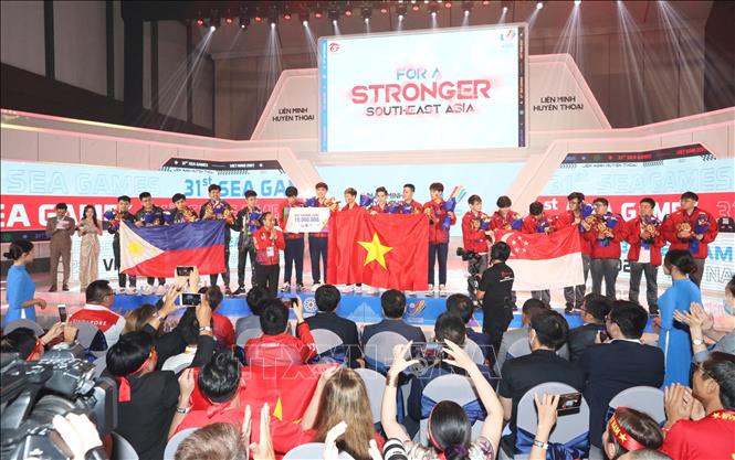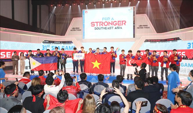 Tối 22/5/2022, tại Trung tâm Hội nghị Quốc gia (Hà Nội) diễn ra trận thi đấu chung kết nội dung Liên minh huyền thoại giữa đội tuyển Việt Nam và đội tuyển Philippines. Chung cuộc, đội tuyển Việt Nam đã xuất sắc giành chiến thắng với tỷ số 3-0, mang về tấm HCV nội dung Liên minh huyền thoại, môn Thể thao điện tử (E-Sport) tại SEA Games 31. Ảnh: Minh Đông-TTXVN