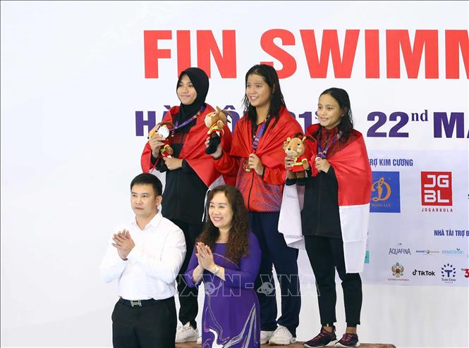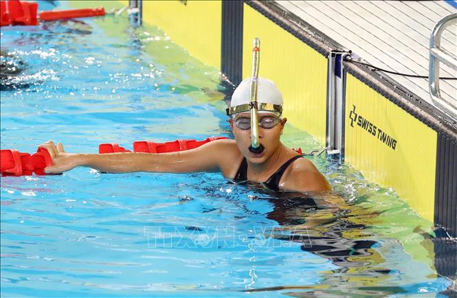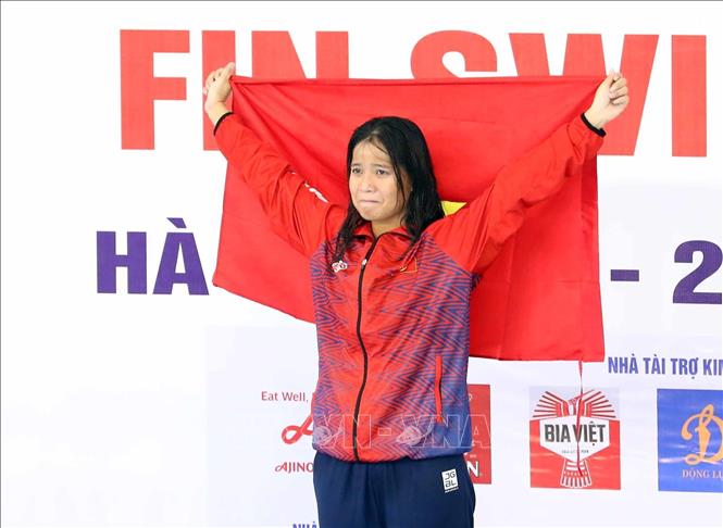 Ngày 22/5/2022, tại Cung thể thao dưới nước (Hà Nội), VĐV Phạm Thị Kim Thương (Việt Nam) giành HCV và phá kỷ lục SEA Games nội dung 800m lặn vòi hơi chân vịt nữ với thành tích 7 phút 19 giây 18. Ảnh: Phạm Kiên - TTXVN