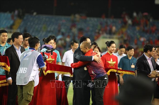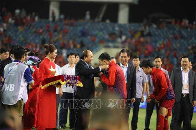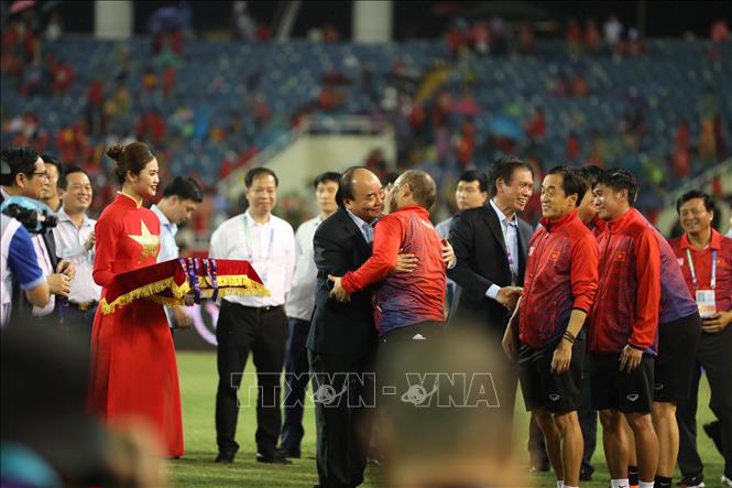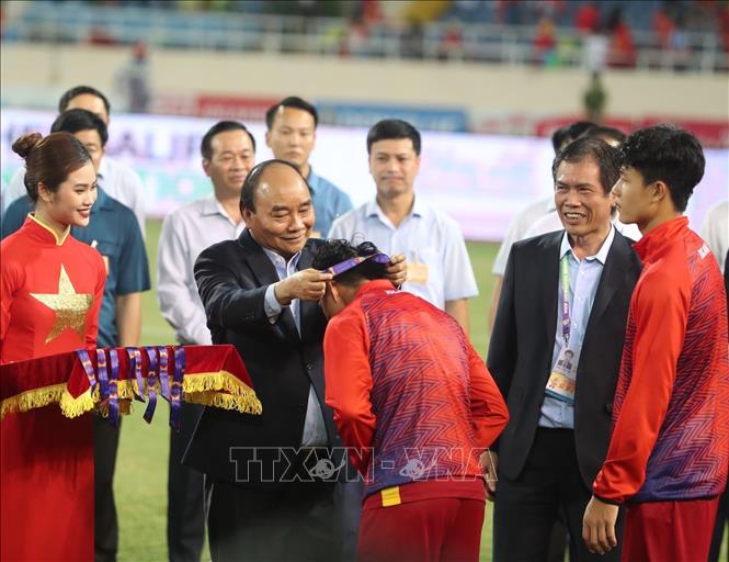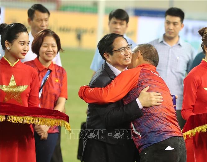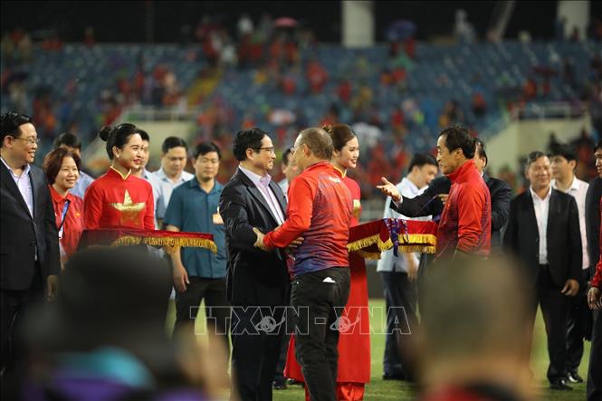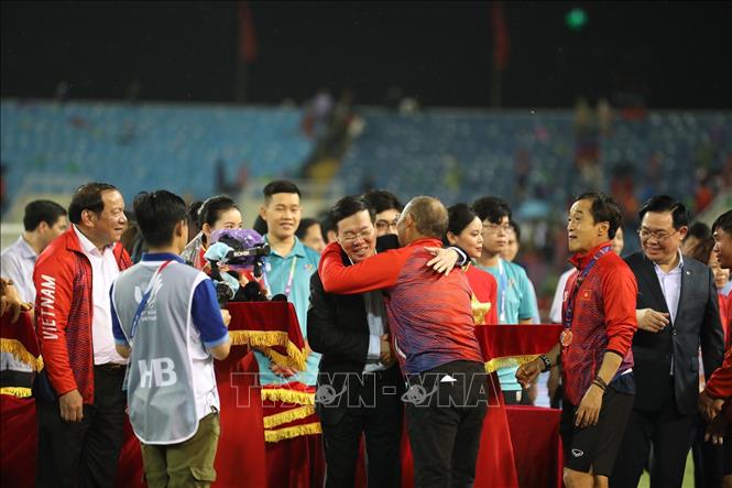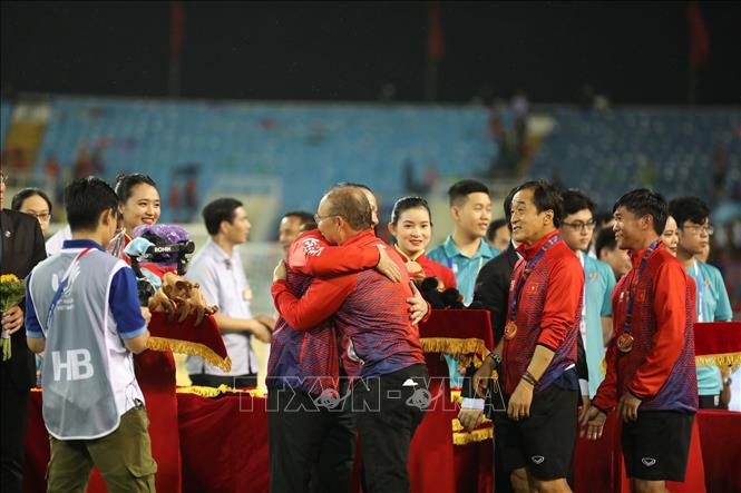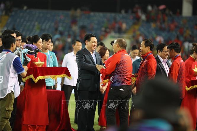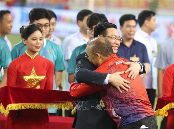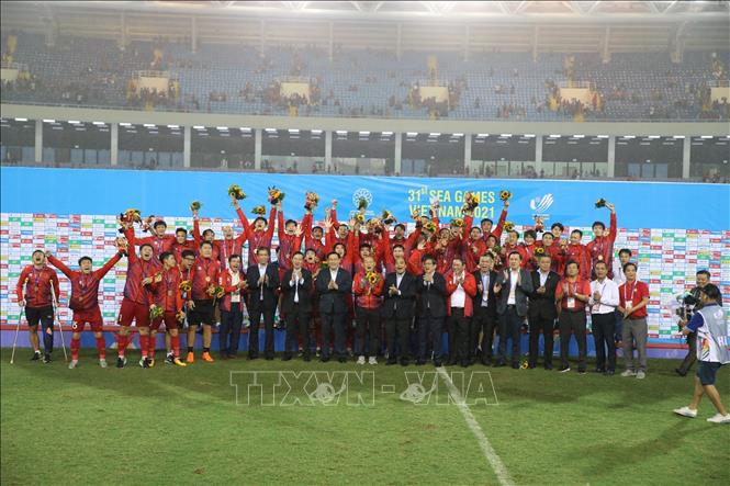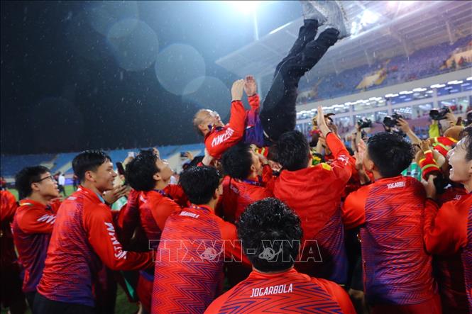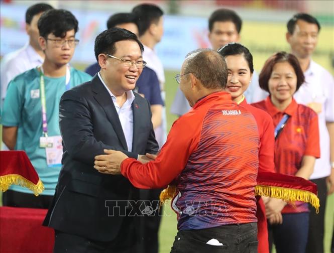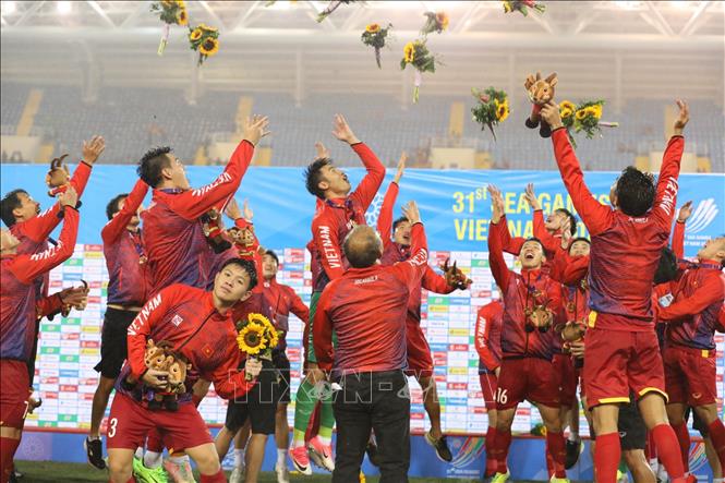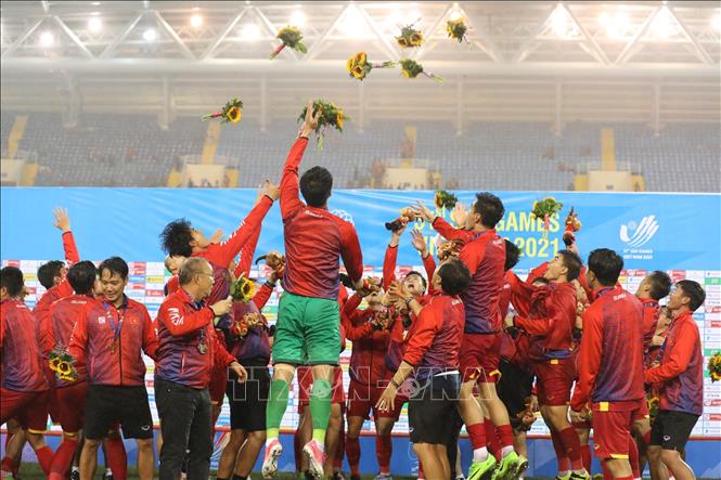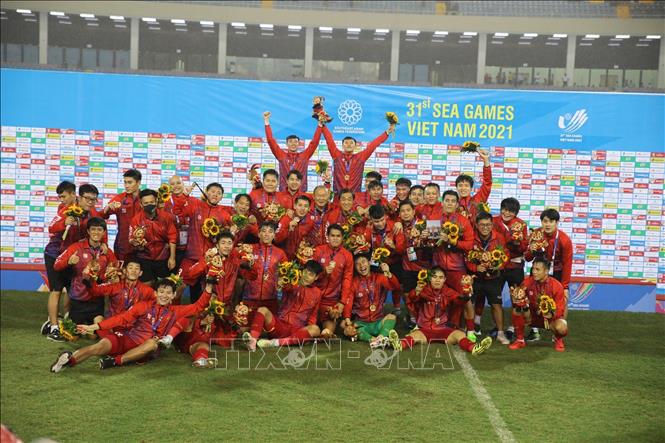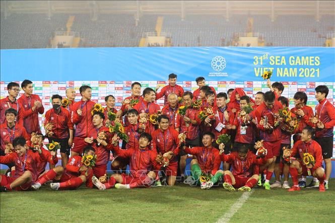 Tối 22/5/2022, trên SVĐ quốc gia Mỹ Đình (Hà Nội) diễn ra trận chung kết môn Bóng đá nam SEA Games 31 giữa U23 Việt Nam (áo đỏ) và U23 Thái Lan (áo vàng). Kết thúc trận đấu, U23 Việt Nam thắng với tỷ số 1-0, giành huy chương Vàng. Ảnh: TTXVN