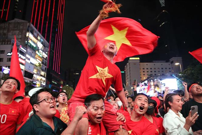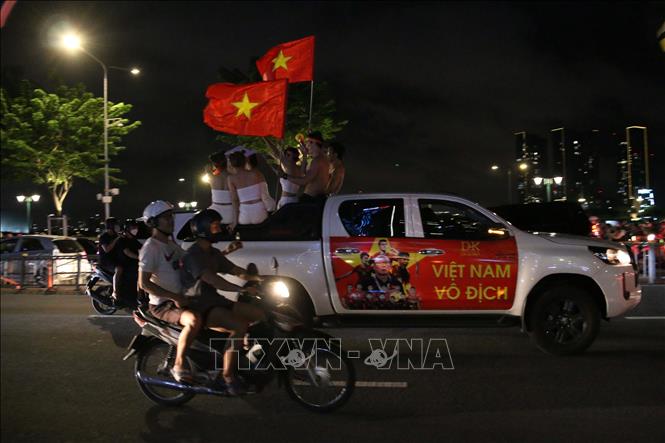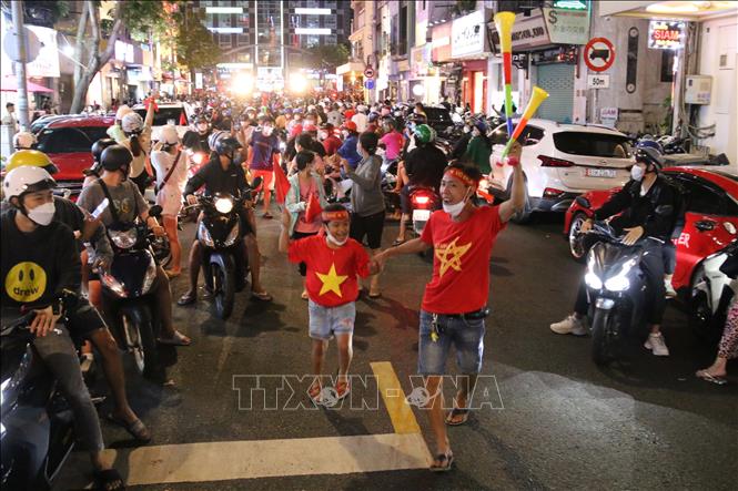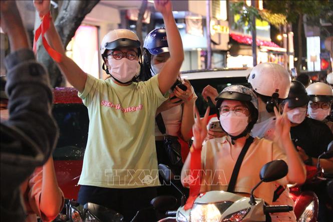 Hòa chung không khí chiến thắng trận chung kết bóng đá nam SEA Games 31 của đội tuyển U23 Việt Nam trước U23 Thái Lan giành ngôi vô địch, tối 22/5/2022, hàng chục ngàn cổ động viên Thành phố Hồ Chí Minh đã dồn về các tuyến đường khu vực trung tâm Thành phố diễu hành với rực rỡ cờ đỏ sao vàng, kèn, loa… tạo nên không khí vui tươi, phấn khởi trong đêm chiến thắng của đội tuyển. Ảnh: Thanh Vũ - TTXVN