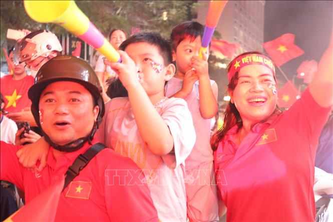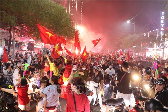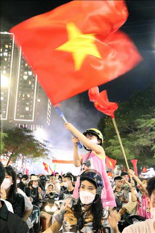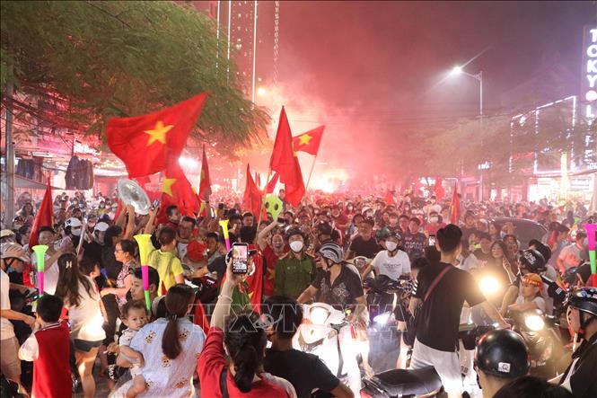 Trước chiến thắng nghẹt thở của đội tuyển U23 Việt Nam trước Thái Lan và của đội tuyển bóng đá nữ Việt Nam cũng với các tuyển thủ nữ Thái Lan, tối ngày 22/5/2022, khắp các ngả đường thành phố Hải Phòng đều ngập tràn người hâm mộ với sắc đỏ của cờ phướn để ăn mừng cho chiến thắng toàn diện của bóng đá nước nhà tại SEA Games 31. Để đảm bảo an toàn giao thông cũng như an ninh trật tự, Công an Hải Phòng đã tăng cường lực lượng chốt chặn, hướng dẫn giao thông tại các tuyến phố chính. Ảnh: Hoàng Ngọc-TTXVN