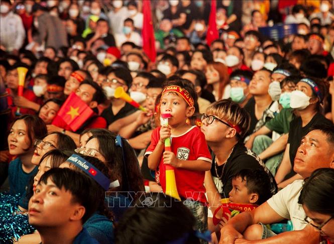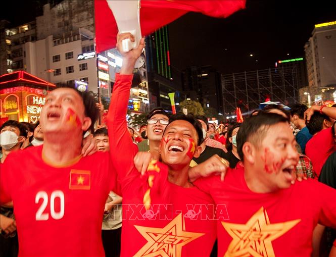 Tối 22/5/2022, tại Phố đi bộ Nguyễn Huệ, hàng nghìn người hâm mộ TP.HCM đã vỡ òa trong niềm vui chiến thắng của U23 Việt Nam trước U23 Thái Lan trong trận chung kết Sea Games 31. Ảnh: Hồng Đạt-TTXVN