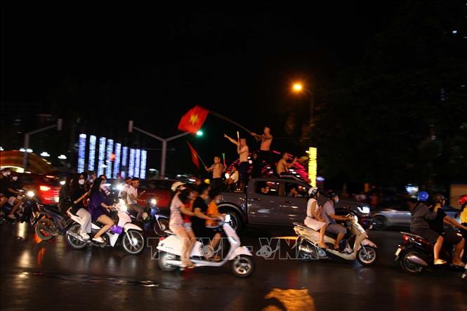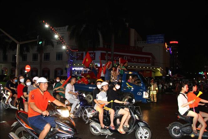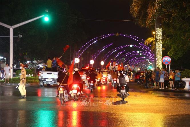 Ngày 22/5/2022, ngay sau tiến còi của trọng tài kết thúc trận chung kết giữa kỳ phùng địch thủ U23 Việt Nam và U23 Thái Lan, hàng vạn cổ động viên xứ Thanh đã vỡ òa trong niềm vui hạnh phúc, tràn xuống đường ăn mừng chức vô địch, bất chấp vào trời mưa khá nặng hạt. Ảnh: TTXVN