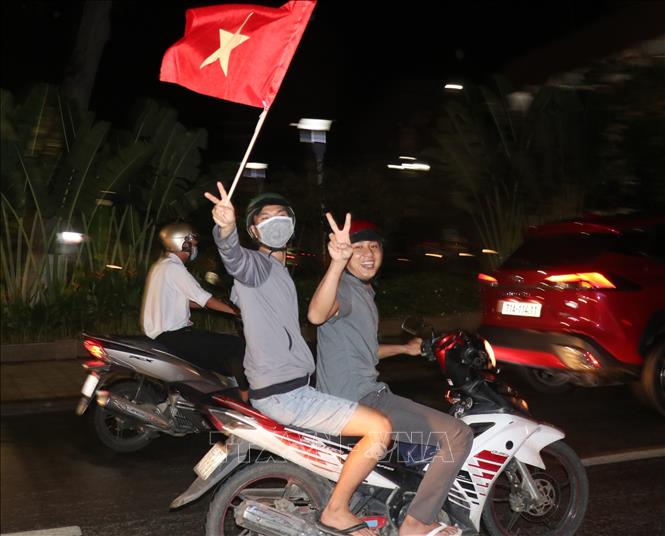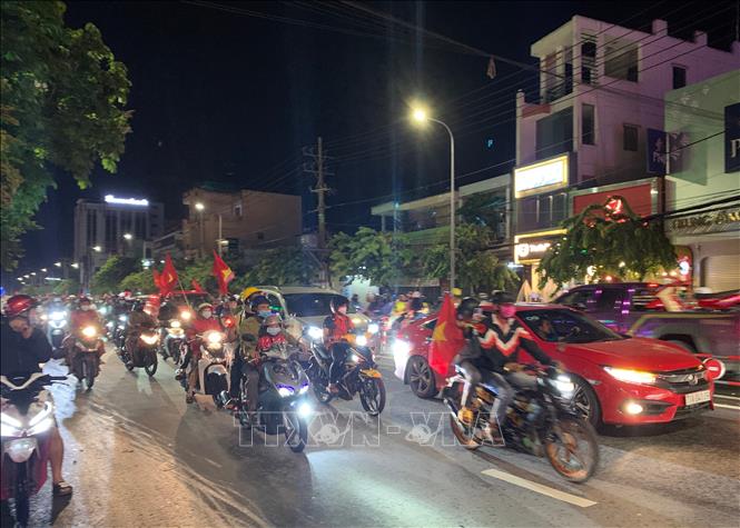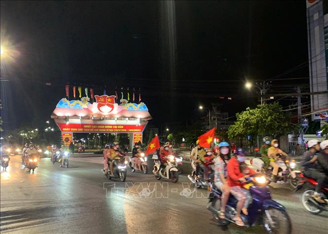 Sau chiến thắng 1-0 trước U23 Thái Lan, đội tuyển U23 Việt Nam bảo vệ thành công chức vô địch bóng đá nam SEA Games 31 vào tối 22/5/2022, hoà chung niềm vui của cả nước, người dân Bến Tre đổ xuống các tuyến đường ăn mừng. Ảnh: Chương Đài - TTXVN