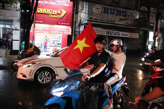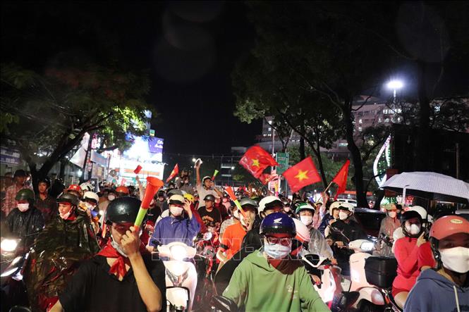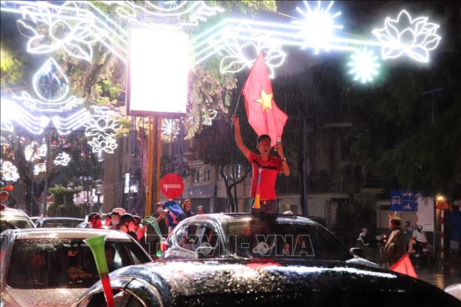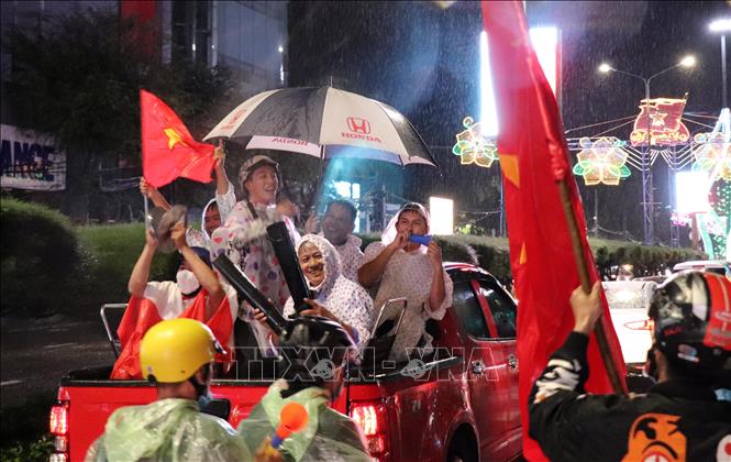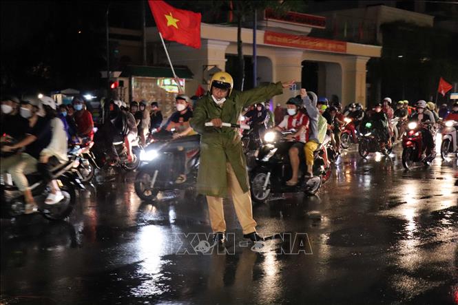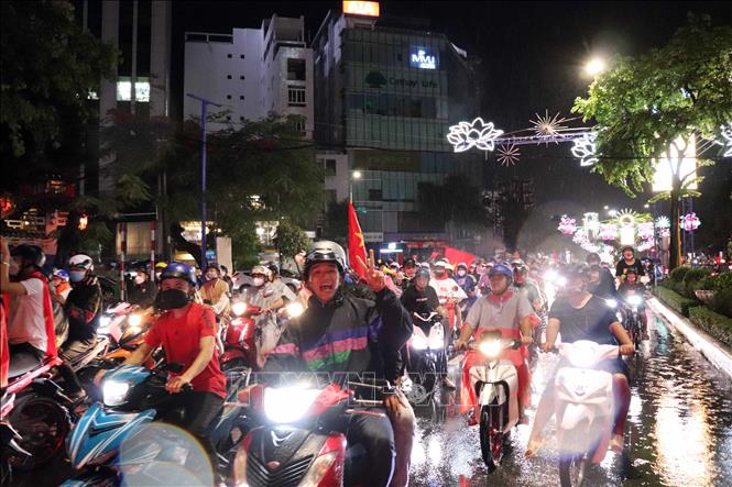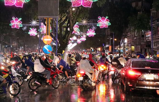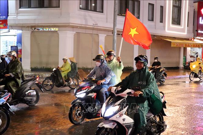Tối 22/5/2022, ngay sau khi đội tuyển bóng đá U23 Việt Nam giành chiến thắng 1-0 trước Thái Lan ở trận chung kết, bảo vệ thành công Huy chương Vàng tại SEA Games 31, mặc dù trời mưa liên tục nhưng đông đảo người dân thành phố Cần Thơ vẫn đổ ra các khu vực trung tâm để ăn mừng chiến thắng. Ảnh: Trung Kiên - TTXVN