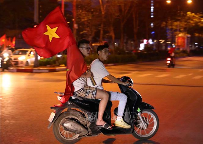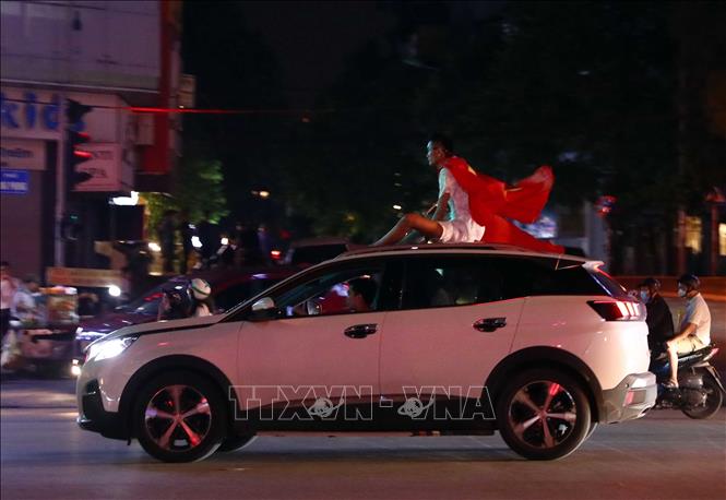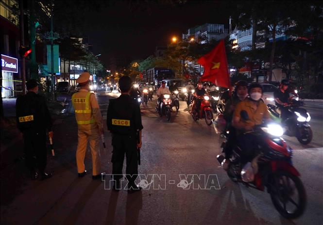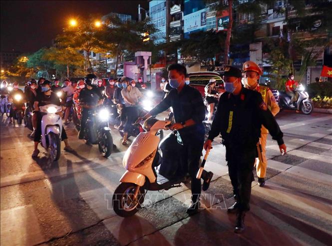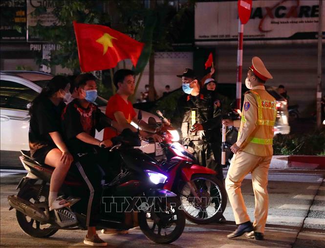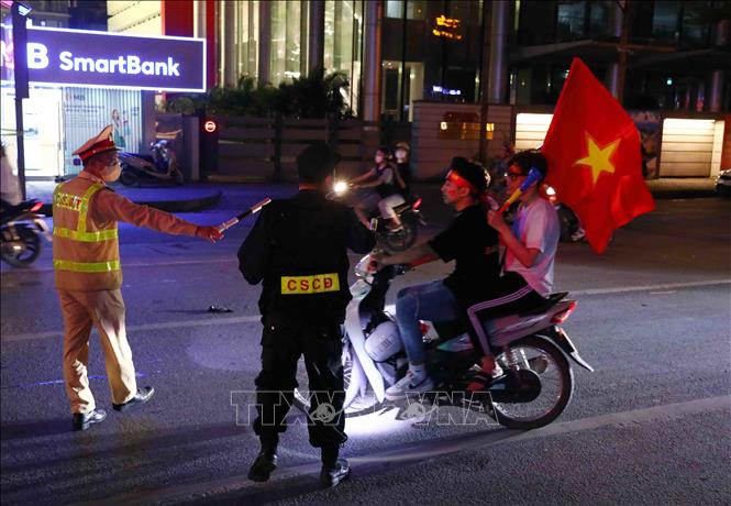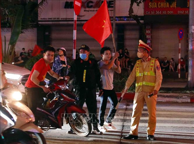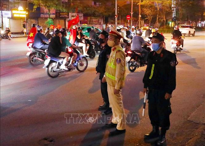 Ngay sau khi tiếng còi mãn cuộc trận chung kết bóng đá nam SEA Games 31 với chiến thắng thuộc về Đội tuyển U23 Việt Nam. Hàng vạn cổ động viên đổ ra khắp các phố Hà Nội để ăn mừng, trong đó có nhiều đối tượng lợi dụng không khia ăn mừng, hòa vào dòng người để "càn quấy", lạng lách đánh võng, gây mất an ninh trật tự, nn toàn giao thông. Để xử lý tình trạng trên, Công an thành phố Hà Nội đã bố trí 15 tổ cảnh sát 141 chốt trên các tuyến phố chính vừa phân luồng giao thông, vừa xử lý các trường hợp đua xe trái phép. Ảnh: Phạm Kiên - TTXVN