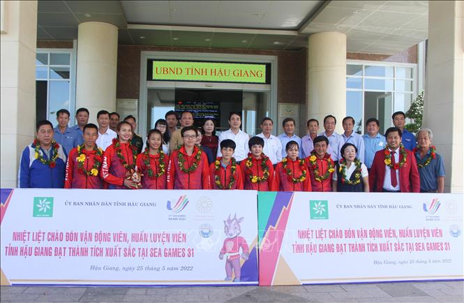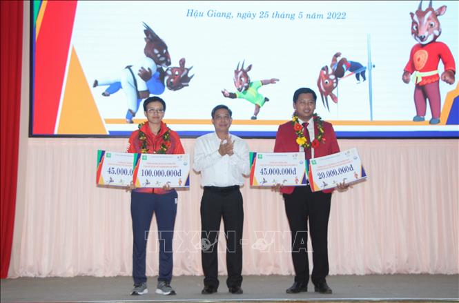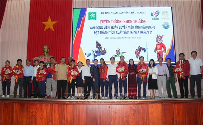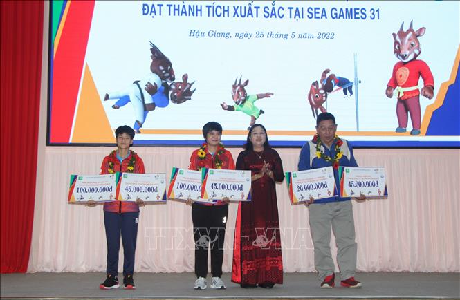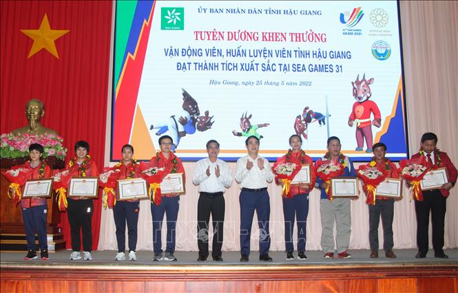Sáng 25/5/2022, UBND tỉnh Hậu Giang tổ chức Lễ phát thưởng huấn luyện viên và vận động viên tỉnh Hậu Giang đạt thành tích tại Đại hội Thể thao Đông Nam Á lần thứ 31 (SEA Games 31). Tại SEA Games 31, tỉnh Hậu Giang có 7 vận động viên tham gia tranh tài 4 môn thi đấu, trong đó, vận động viên Phạm Thị Diễm (môn Điền kinh); Trần Lê Lan Anh - Thái Thị Hồng Thoa (môn Bi sắt); Nguyễn Tường Vy (môn Judo) đã mang về 3 huy chương vàng và vận động viên Trần Lê Thanh Thảo mang về 1 huy chương bạc nội dung bộ ba nữ, môn bi sắt. Dịp này, Chủ tịch UBND tỉnh Hậu Giang tặng Bằng khen cho 8 cá nhân có thành tích xuất sắc tại SEA Games 31. Ảnh: Hồng Thái - TTXVN