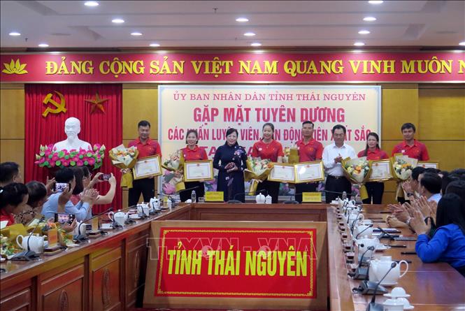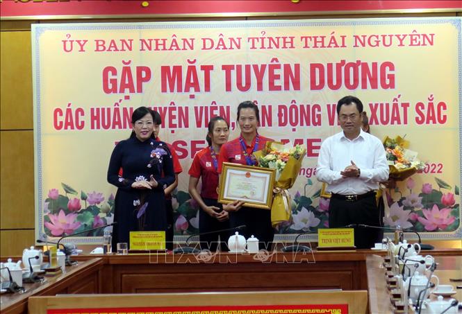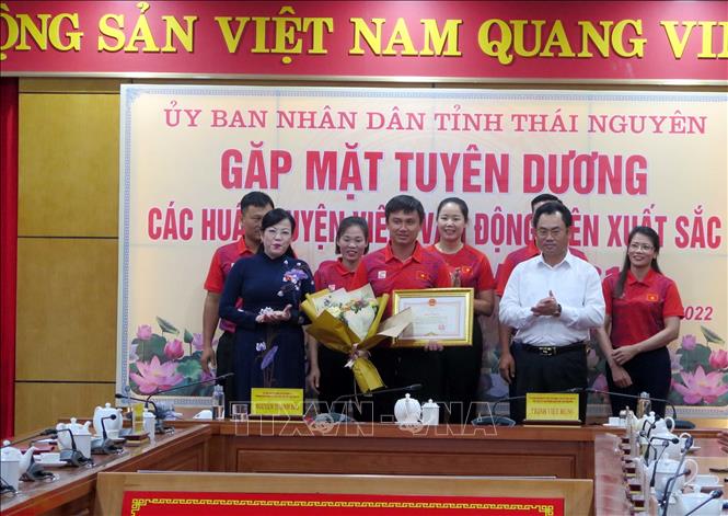 Chiều 25/5/2022, Uỷ ban nhân dân tỉnh Thái Nguyên tổ chức gặp mặt, tặng bằng khen cho 10 huấn luyện viên, vận động viên xuất sắc tại SEA Games 31. Ảnh: Quân Trang-TTXVN