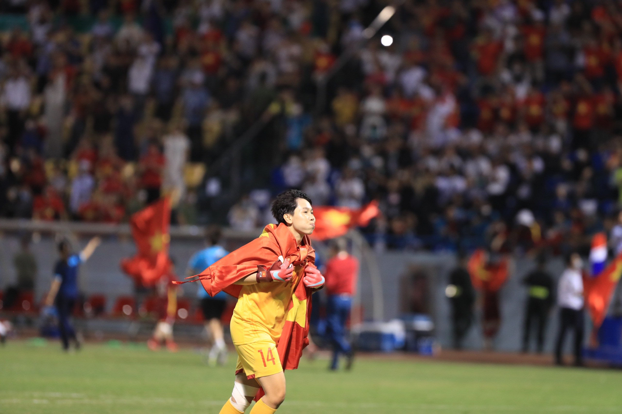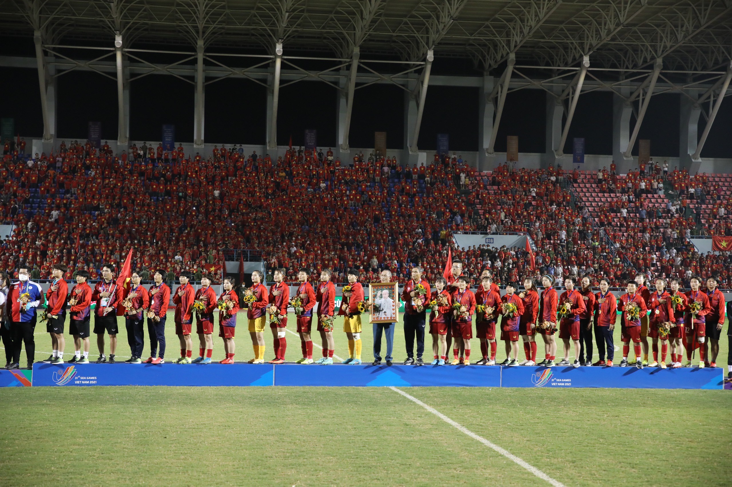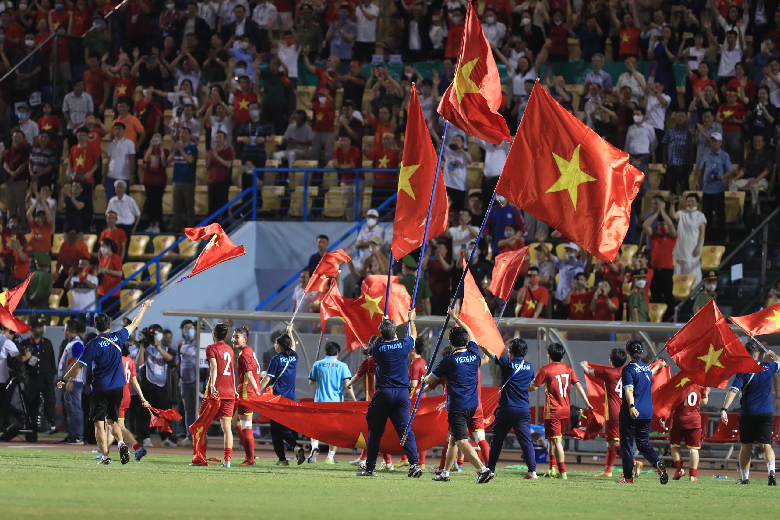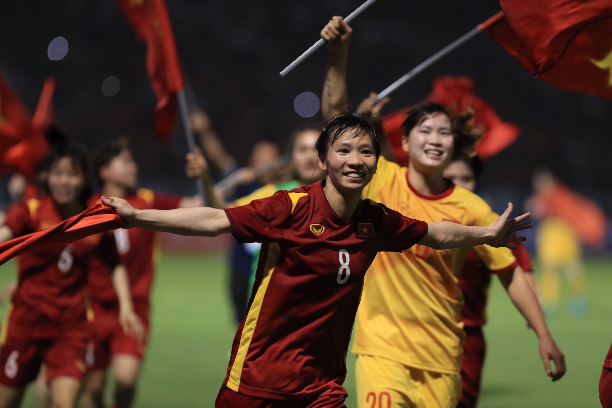 Tối 21/5/2022, trên SVĐ Cẩm Phả (tỉnh Quảng Ninh) diễn ra trận chung kết môn Bóng đá nữ tại SEA Games 31 giữa đội tuyển nữ Việt Nam (áo đỏ) gặp đội tuyển nữ Thái Lan (áo xanh). Phút 59, tiền vệ đội trưởng Huỳnh Như ghi bàn thắng duy nhất của trận đấu. Thắng 1 – 0, Đội tuyển nữ Việt Nam giành huy chương Vàng môn Bóng đá nữ tại SEA Games 31. Ảnh: TTXVN