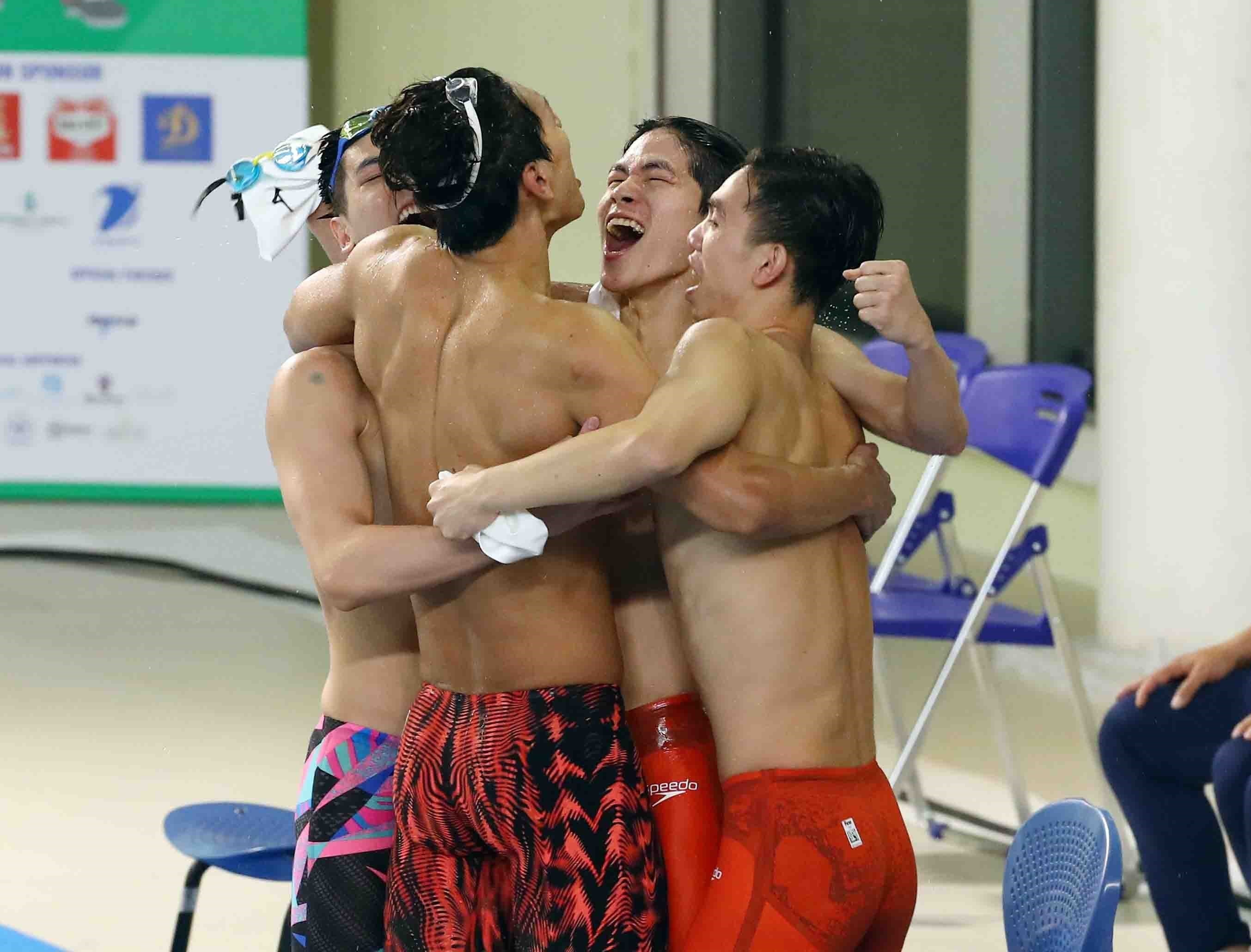 Đội tuyển bơi Việt Nam gồm: (từ trái qua phải) Nguyễn Huy Hoàng, Nguyễn Hữu Kim Sơn, Trần Hưng Nguyên, Hoàng Quý Phước giành HCV, đồng thời phá kỷ lục SEA Games nội dung 4x200m bơi tiếp sức tự do nam với thành tích 7 phút 16 giây 31.