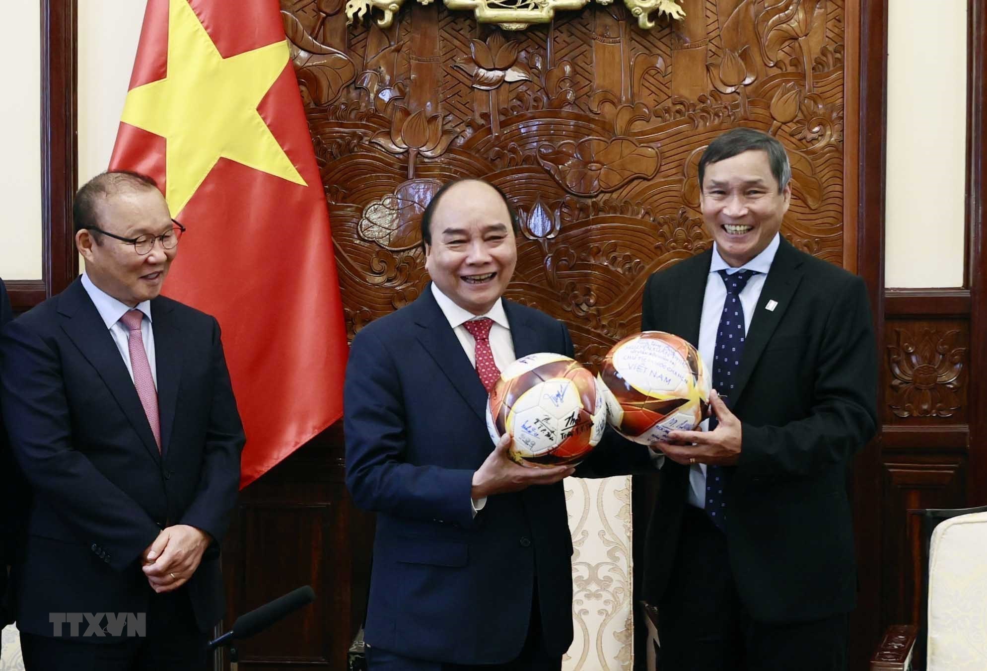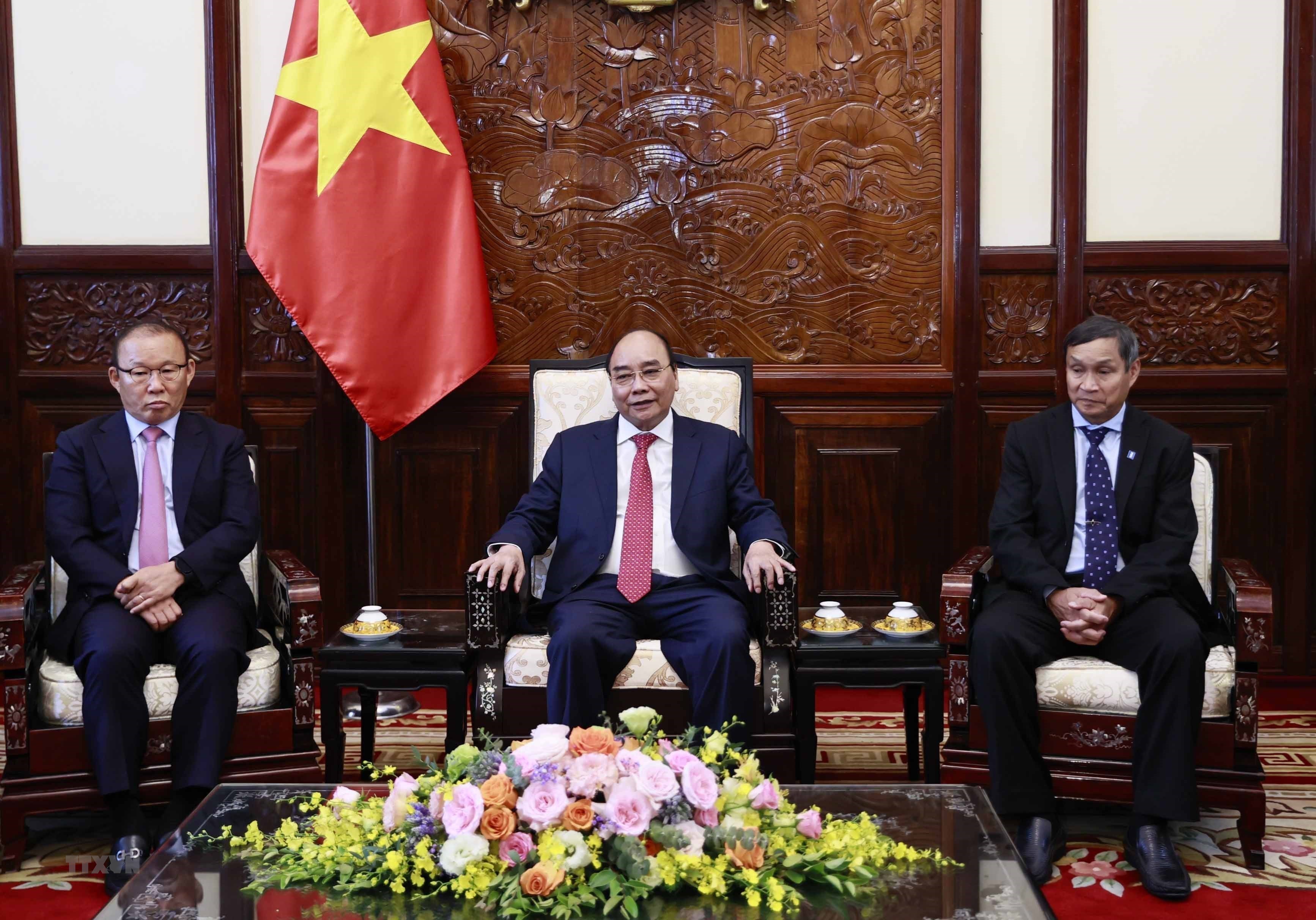 Sáng 28/5, tại Phủ Chủ tịch, Chủ tịch nước Nguyễn Xuân Phúc tiếp Huấn luyện viên bóng đá nam Park Hang-seo và Huấn luyện viên bóng đá nữ Mai Đức Chung.